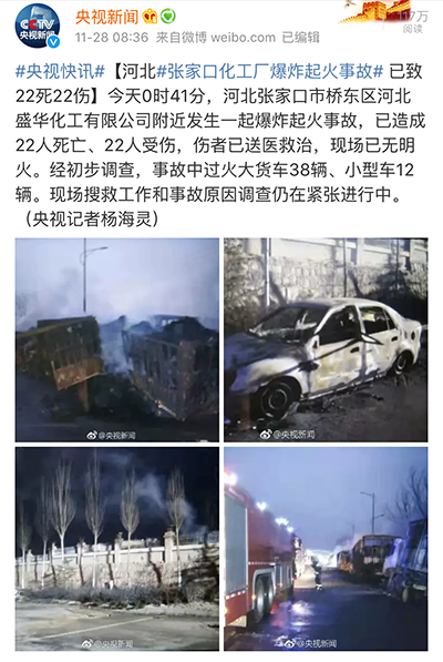 11月28日零时41分,在张家口市桥东区河北盛华化工有限公司附近发生的爆炸起火事故,经公安消防现场搜救确认,目前有22人死亡,22名伤者已分别送往河北北方学院第一医院和251等医院救治。