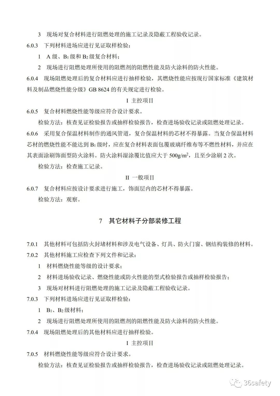 6.0.5 首先应检查设计中各部位复合材料的燃烧性能等级要求,然后通过检查进场验收记录确认各部位复合材料是否满足设计要求。对于没有达到设计要求的复合材料,再检查是否有现场阻燃处理施工记录及抽样检验报告。