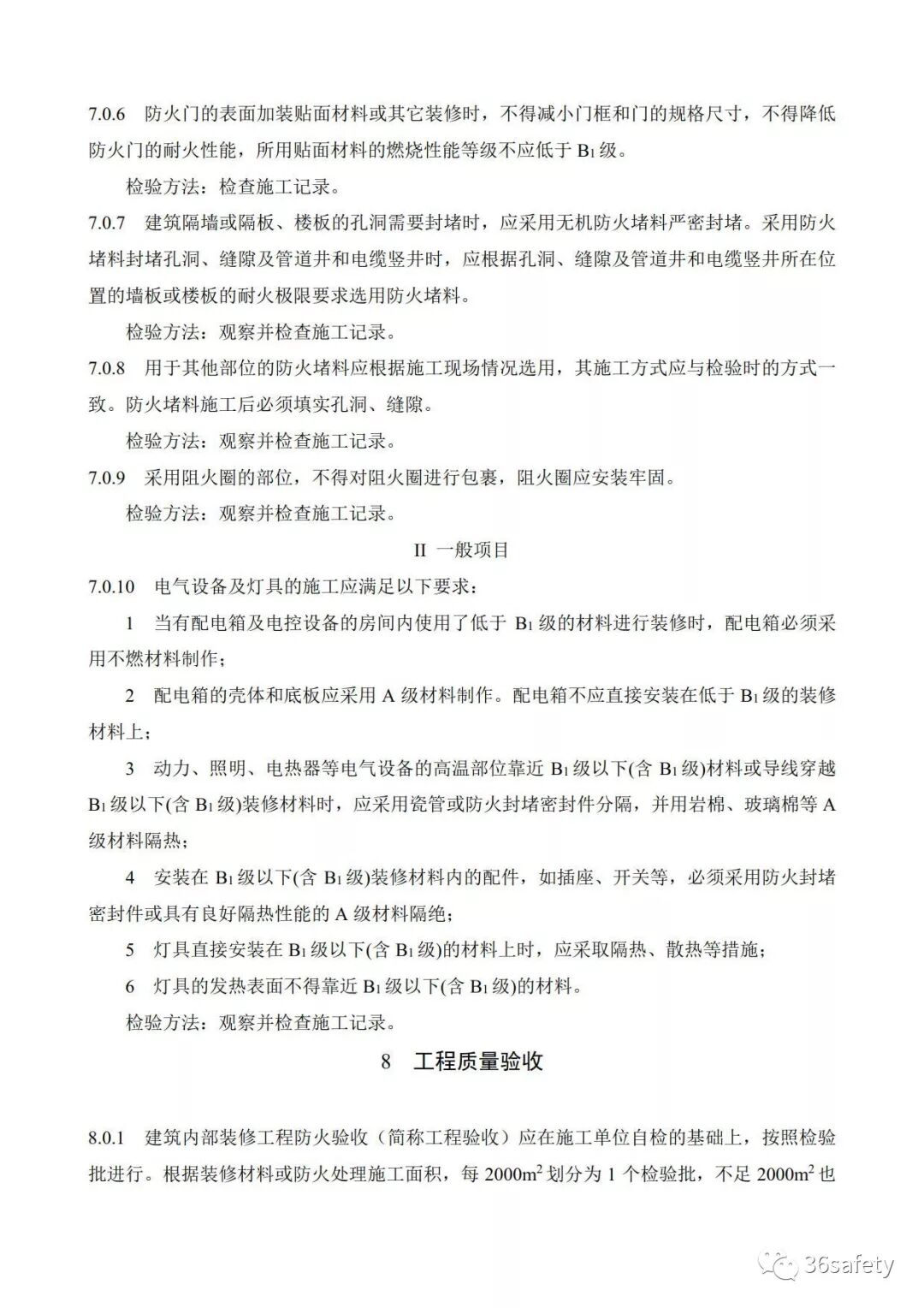 建筑内部装修的防火施工与验收主要包括三方面的内容:一是审查建筑内部装修所选用的材料是否满足防火设计规范要求,并对材料进场、施工、见证取样检验和抽样检验进行了规定;二是对建筑内部装修施工过程中的控制项目和检验方法提出要求;三是建筑内部装修竣工后对总体的防火施工质量给出是否合格的结论。