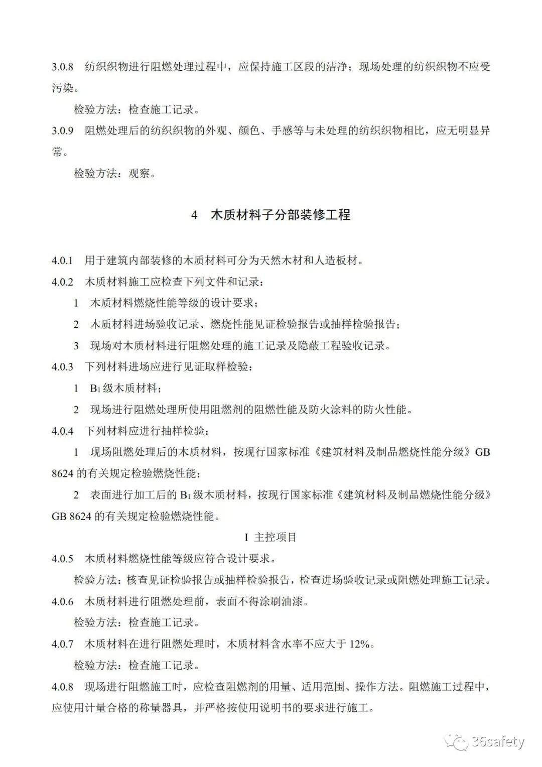 4.0.5 首先应检查设计中各部位木质装修材料的燃烧性能等级要求,然后通过检查进场验收记录确认各部位木质装修材料是否满足设计要求。对于没有达到设计要求的木质装修材料,再检查是否有现场阻燃处理施工记录及抽样检验报告。