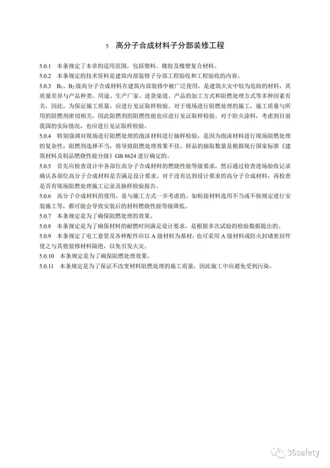 5.0.6 高分子合成材料的使用,是与施工方式一并考虑的。如粘接材料选用不当或不按规定进行安装施工等,都可能会导致安装后的材料燃烧性能等级降低。