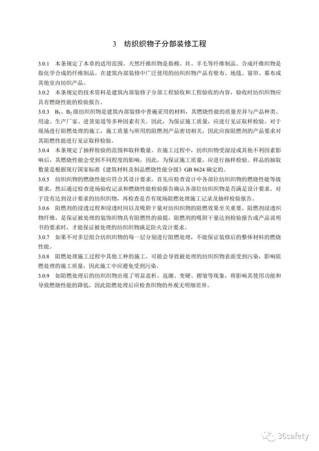 3.0.2 本条规定的技术资料是建筑内部装修子分部工程验收和工程验收的内容,验收时纺织织物应具有燃烧性能的检验报告。