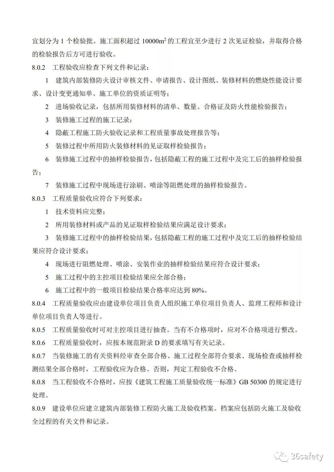 8.0.5 本条规定工程质量验收过程中,对重点部位,或有异议的装修材料,可进行抽样检查,是为了确保施工质量符合防火设计要求。