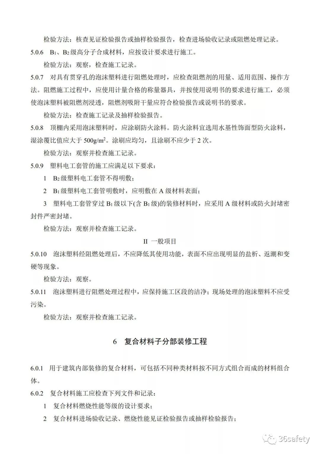 5.0.3 B1、B2级高分子合成材料在建筑内部装修中被广泛使用,是建筑火灾中较为危险的材料,其质量差异与产品种类、用途、生产厂家、进货渠道、产品的加工方式和阻燃处理方式等多种因素有关,因此,为保证施工质量,应进行见证取样检验。对于现场进行阻燃处理的施工,施工质量与所用的阻燃剂密切相关,因此阻燃剂的阻燃性能也应进行见证取样检验。对于防火涂料,考虑到目前我国的实际情况,也应进行见证取样检验。