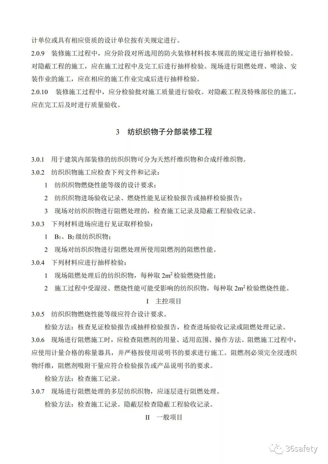 3.0.3 B1、B2级纺织织物是建筑内部装修中普遍采用的材料,其燃烧性能的质量差异与产品种类、用途、生产厂家、进货渠道等多种因素有关。因此,为保证施工质量,应进行见证取样检验。对于现场进行阻燃处理的施工,施工质量与所用的阻燃剂产品密切相关,因此应按阻燃剂的产品要求对其阻燃性能进行见证取样检验。